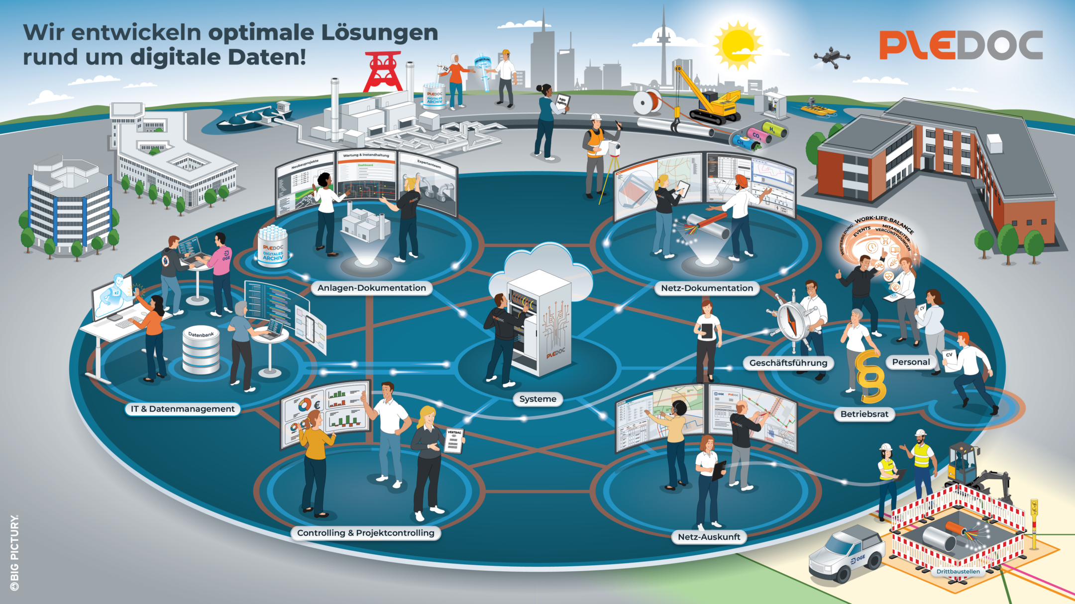 Together with PLEdoc, a big picture was developed – a visual overview that presents the diverse tasks, responsibilities and interfaces within the company in a clear and understandable way.