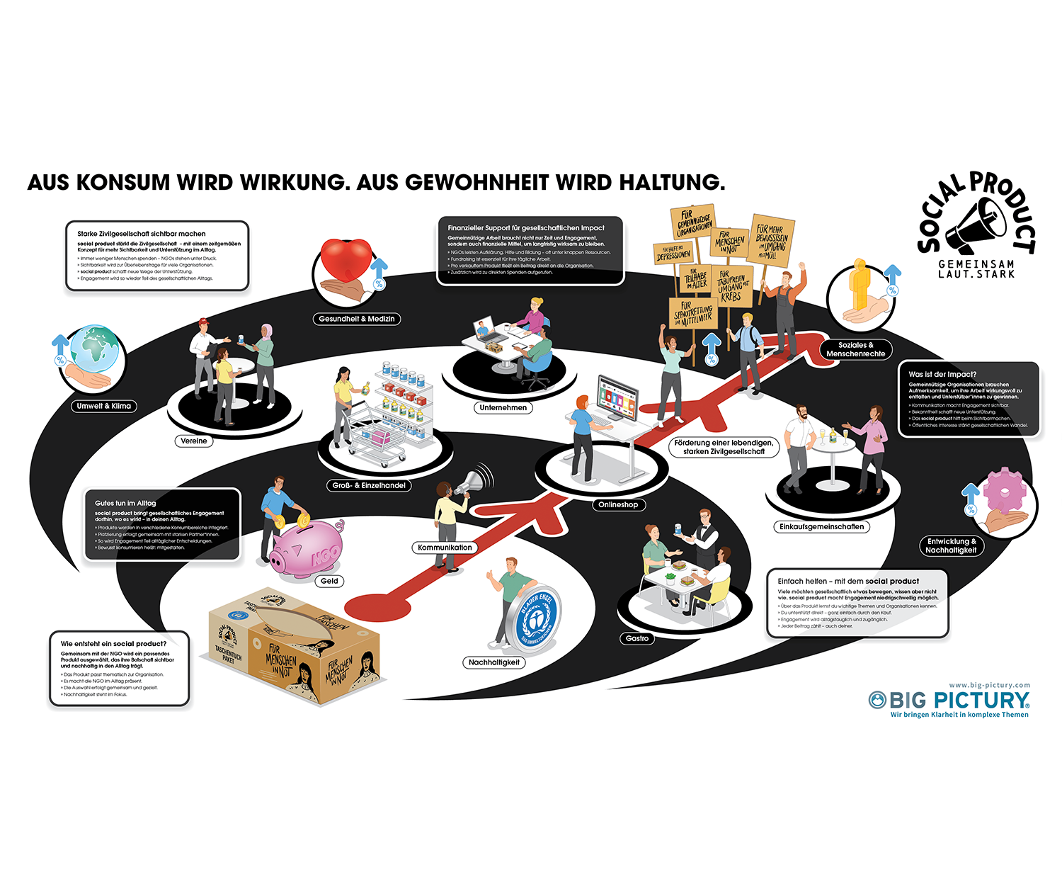 The aim of the project was to visualize the idea and impact of social products in a clear and memorable visual language. The result is a Big Picture as a communication tool that shows how social impact can be created through conscious consumption in everyday life. People buy products that support an NGO at the same time – social commitment is embedded in everyday decisions in a simple and sustainable way.