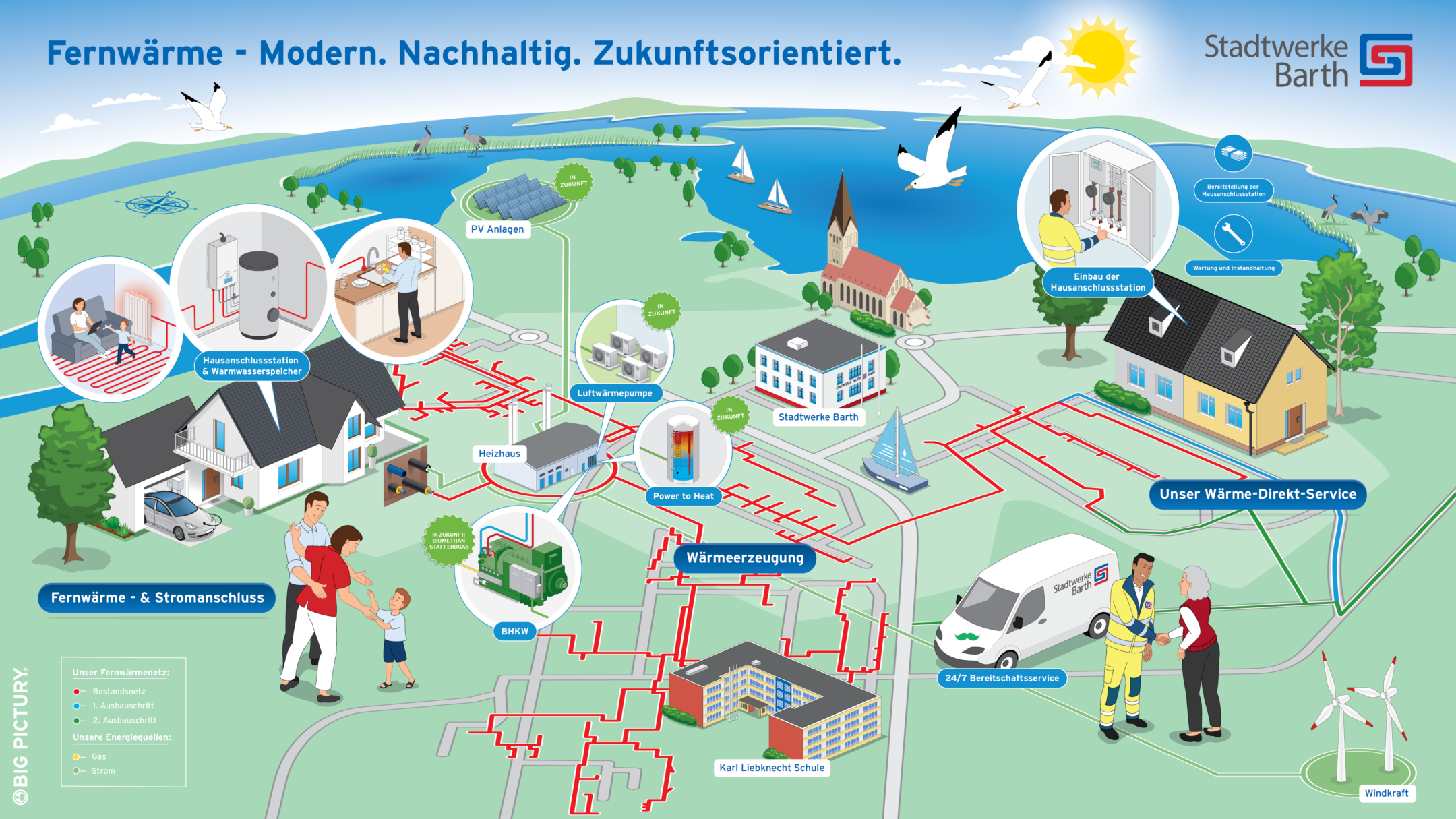 The Barth municipal utilities are facing the challenge of expanding the district heating network in a residential area while at the same time gaining acceptance and trust among citizens. This requires education: How does district heating work? Where does the energy come from – today and tomorrow? The Big Picture was intended to be a vivid communication tool that explains the connections at a glance, makes complex technology accessible and highlights the sustainable strategy behind the project.