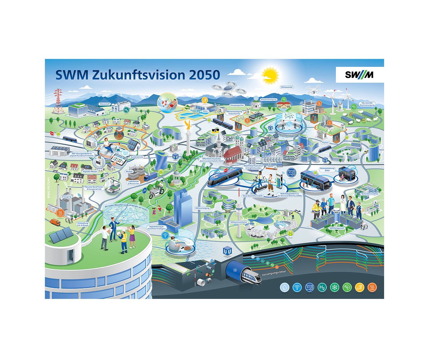 „Big Pictury hat unsere Zukunftsvision 2050 auf eindrucksvolle Weise zum Leben erweckt. Durch das Big Picture verstehen nun über 10.000 Mitarbeitende auf einen Blick, wohin sich die SWM entwickeln und wie alle Bereiche dazu beitragen.Wir haben uns für Big Pictury entschieden, weil das Team nicht nur Erfahrung mit Stadtwerken und der Energiewelt mitbringt, sondern komplexe Strategien visuell klar und ansprechend übersetzen kann. Diese Stärke hat sich im gesamten Projektverlauf bestätigt: flexibel, partnerschaftlich und mit wertvollen Impulsen, die weit über klassische Grafikleistungen hinausgehen.Vom ersten Gespräch bis zum finalen Entwurf fühlten wir uns bestens begleitet – und das Ergebnis spricht für sich: ein Strategiebild, das Orientierung schafft, Identifikation stärkt und unsere Zukunftsvision eindrucksvoll vermittelt.“